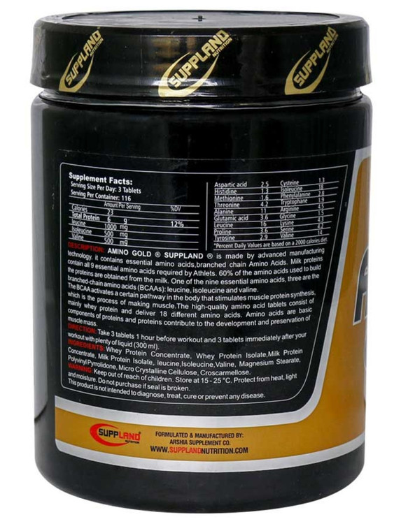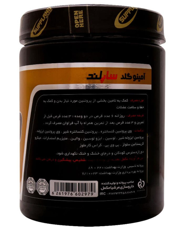 آمینو گلد ۳۵۰ تایی قرص ۲ گرم پروتئین شرکت ساپلند دارای مجوز از سازمان غذا و دارو برچسب اصالت کالا تاریخ بالا