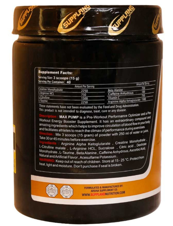 3 پیمانه (معادل 15 گرم) از پودر مکس پمپ ساپلند را با 250 میلیلیتر آب یا آبمیوه سرد مخلوط نموده و 30 الی 45 دقیقه قبل تمرین مصرف کنید.